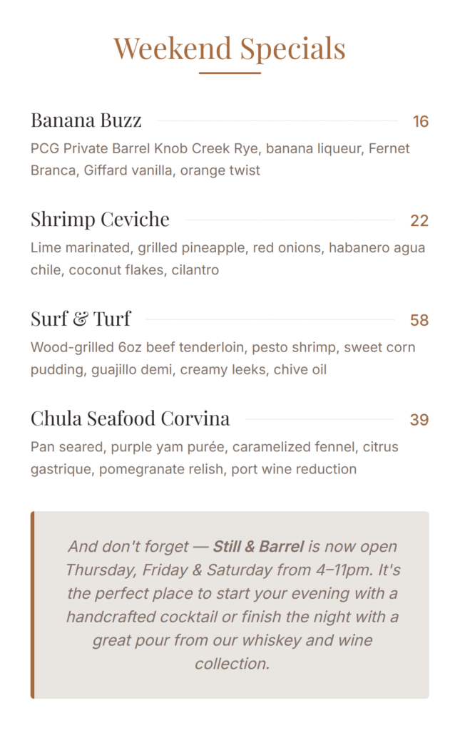 Check back on Wednesdays for the next weekend's specials.